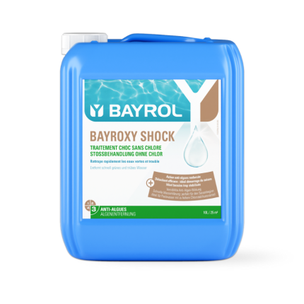 Opta por Bayroxy Shock Bayrol, un tratamiento de choque con oxígeno activo líquido (sin cloro) especialmente diseñado para revitalizar las aguas verdes y eliminar las algas.