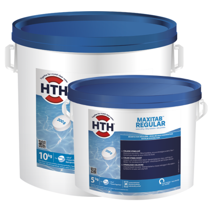 Elija hth® MAXITAB Regular, cloro de liberación lenta, para la cloración permanente de su piscina: eliminación de bacterias, virus, hongos y algas en el agua de la piscina.