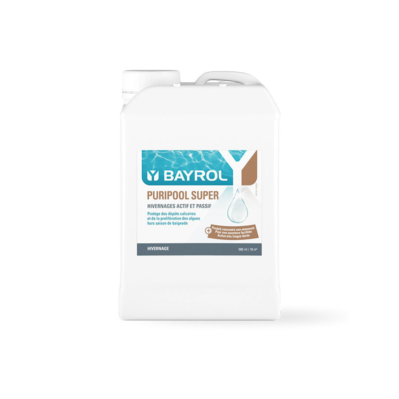 Bayrol Puripool Super Winterizing Product es un producto diseñado específicamente para piscinas que permanecen llenas de agua durante el invierno. Minimiza la formación de depósitos de cal, evita que la suciedad se adhiera y que las algas proliferen, para facilitar la apertura de la piscina en primavera.