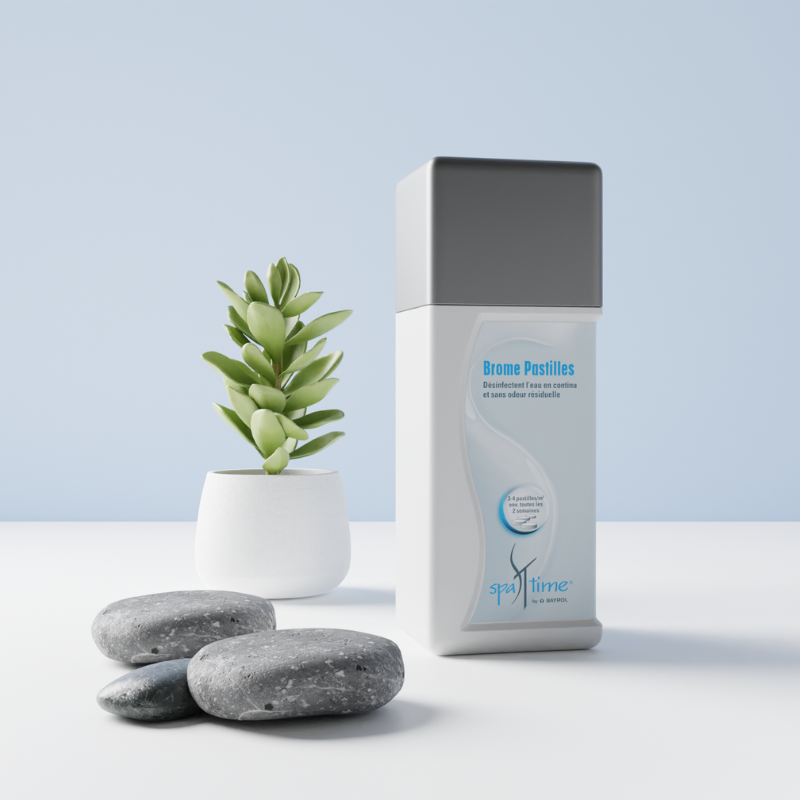 Elija Bayrol Spa Bromo para spas, tabletas SpaTime de 20 g. Las tabletas de bromo Bayrol SpaTime desinfectan eficazmente el agua de su spa. Se disuelven lentamente, liberando sus ingredientes activos durante un período prolongado. El tratamiento con bromo tiene muy poco olor, es suave para la piel, no irrita los ojos, es tan eficaz como el cloro y es inodoro. El producto sigue siendo eficaz incluso cuando el pH del agua es alto.